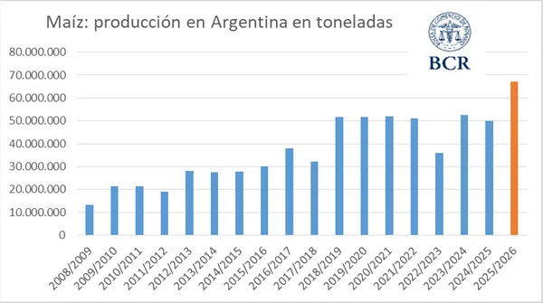 “Con este ajuste en área y los realizados en rendimientos, se estima que Argentina podría producir su mayor cosecha maicera con 67 millones de toneladas, un 34 % más que el ciclo pasado y un 28 % más que en su anterior máxima marca, 52,5 millones de toneladas, hace dos años”, publicó la BCR.